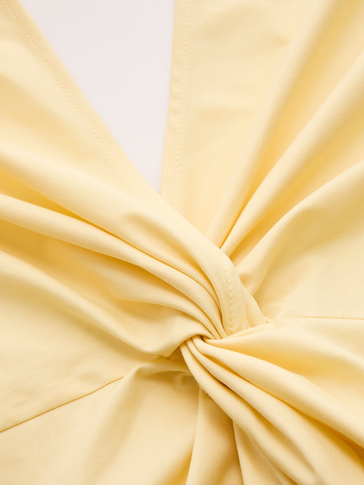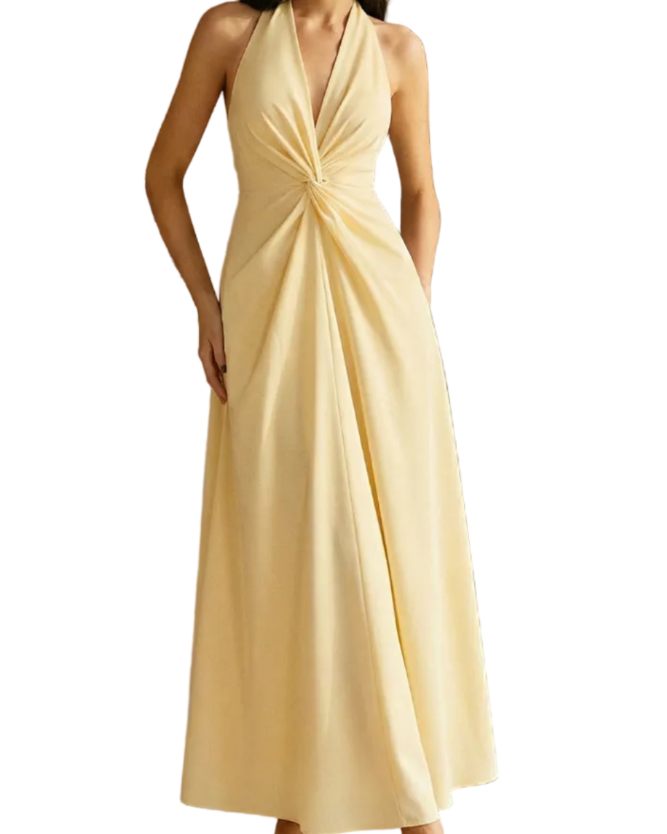 A sleeveless maxi dress featuring a V-neck halter design and a twisted waist detail. Constructed from regular-thickness woven fabric with an invisible zipper closure.