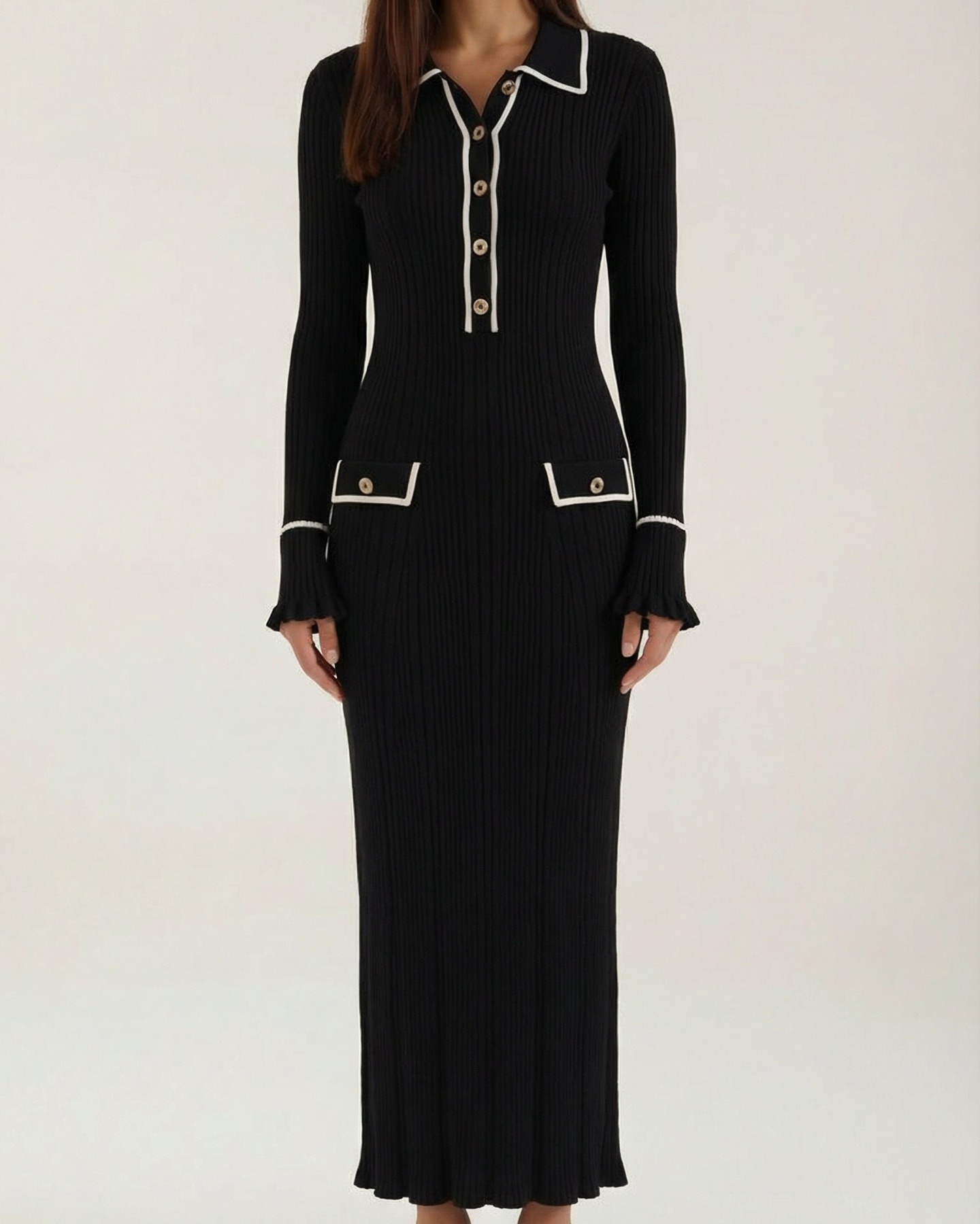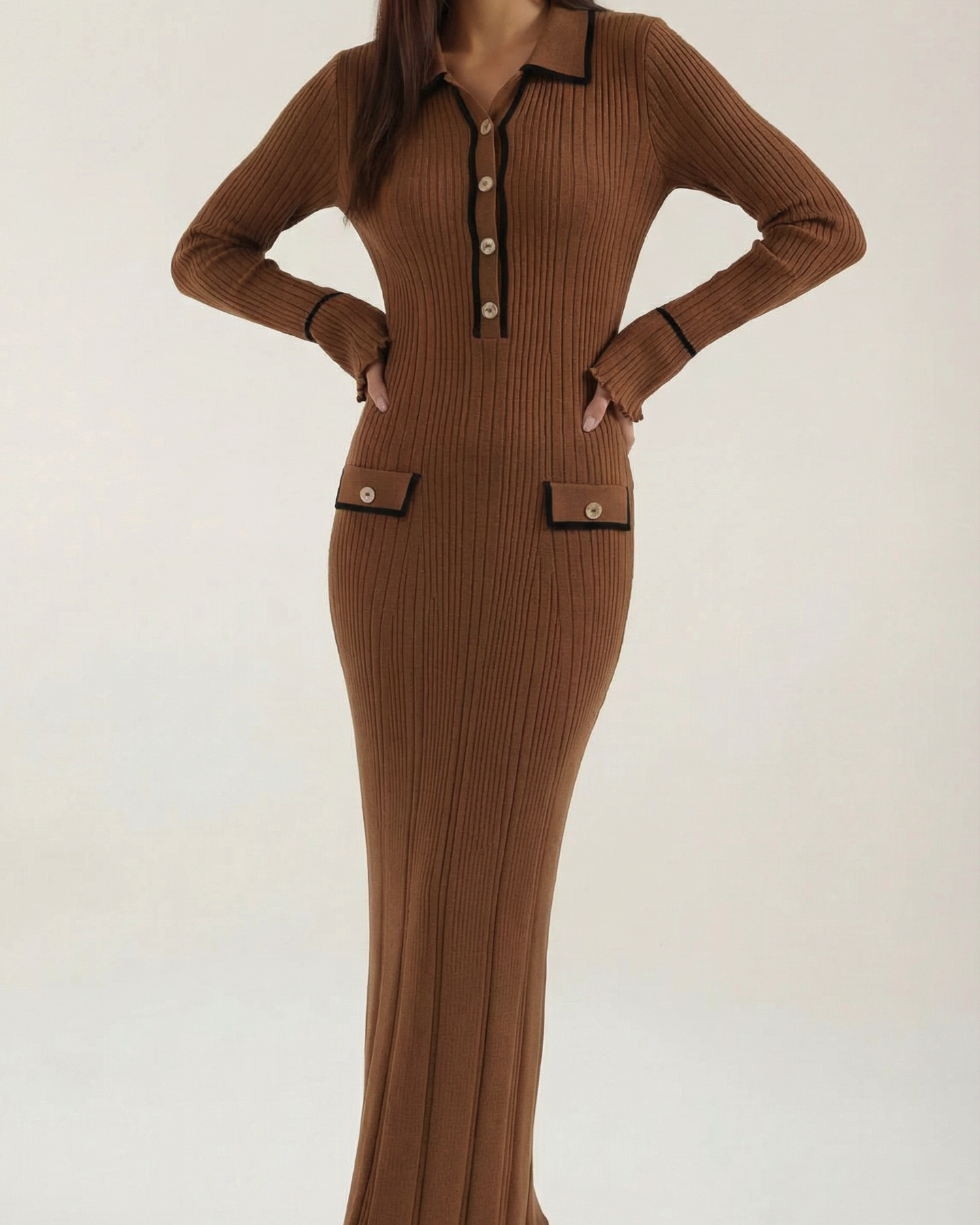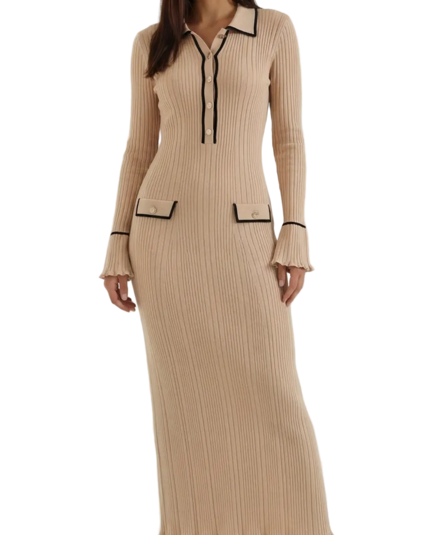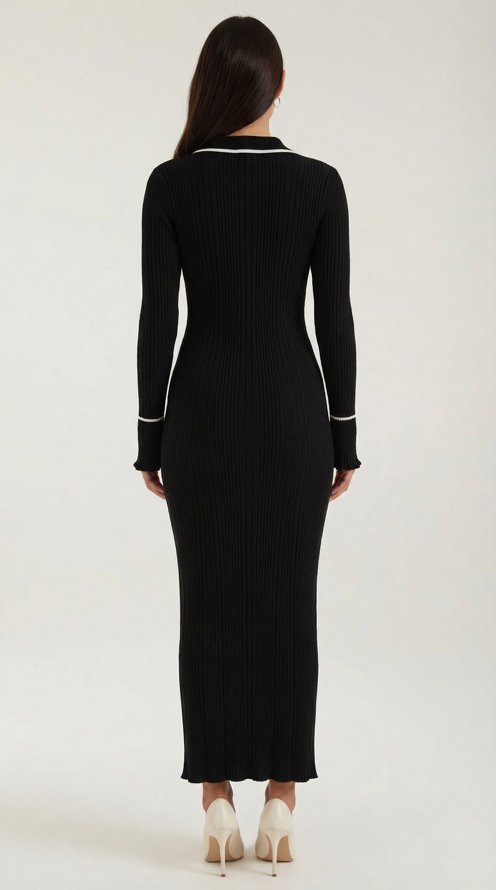 The Silhouette A study in elongated frequency. The Relay combines the rhythmic "ribbed knit texture" of the body with a "vintage-inspired" collar to create a silhouette that spans the full length of the human frame. Featuring a button-front axis and functional pocket accents, the garment functions as a continuous, "one-and-done" structural relay—carrying the eye from the disciplined neckline down to a grounded, floor-length finish.