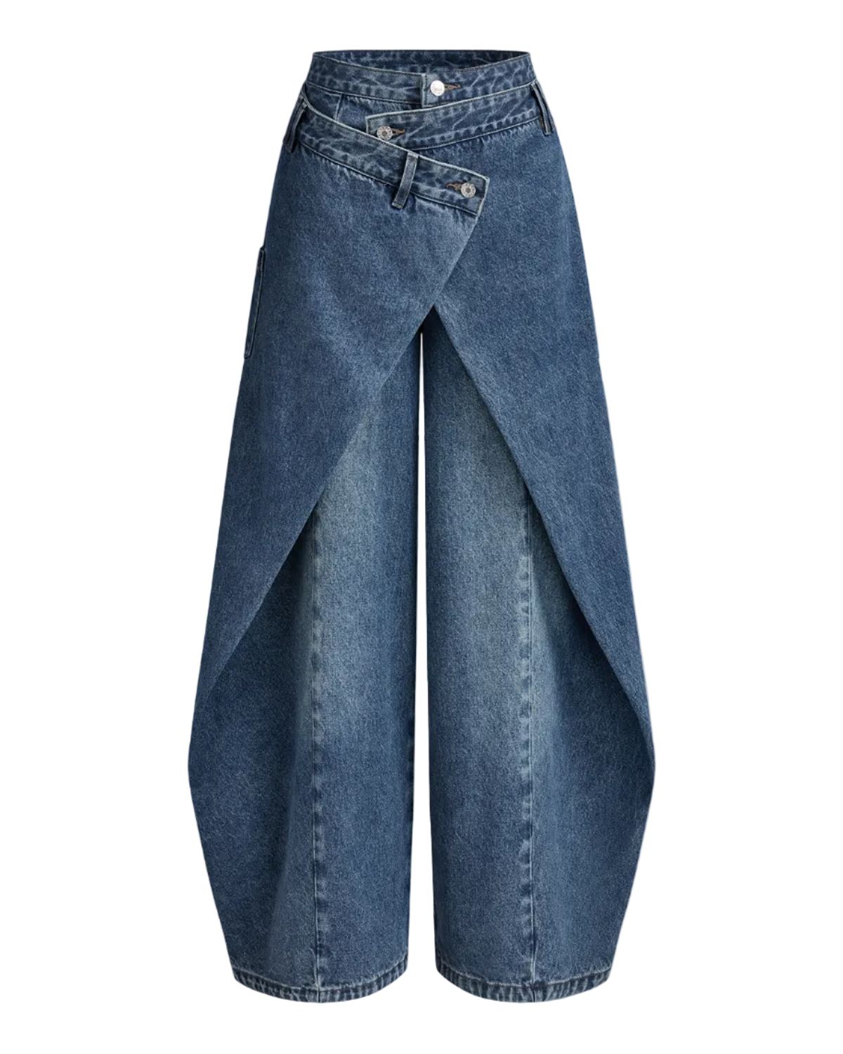 Wide-leg denim with a crossover front closure, mid-waist rise, and long silhouette. Constructed with a slight stretch for structural fluidity.