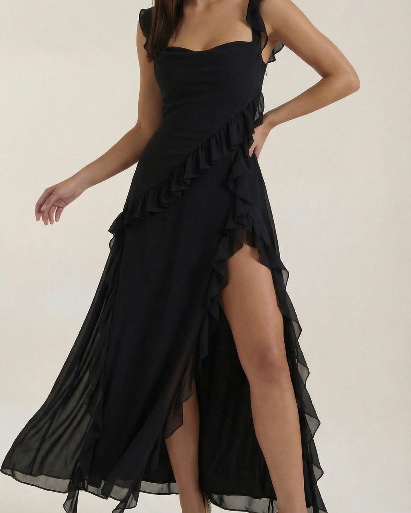 A figure-hugging dress with a wrap-around ruffle that spirals from the waist to the hem, finishing with a high slit. Sleek body, dramatic detail.