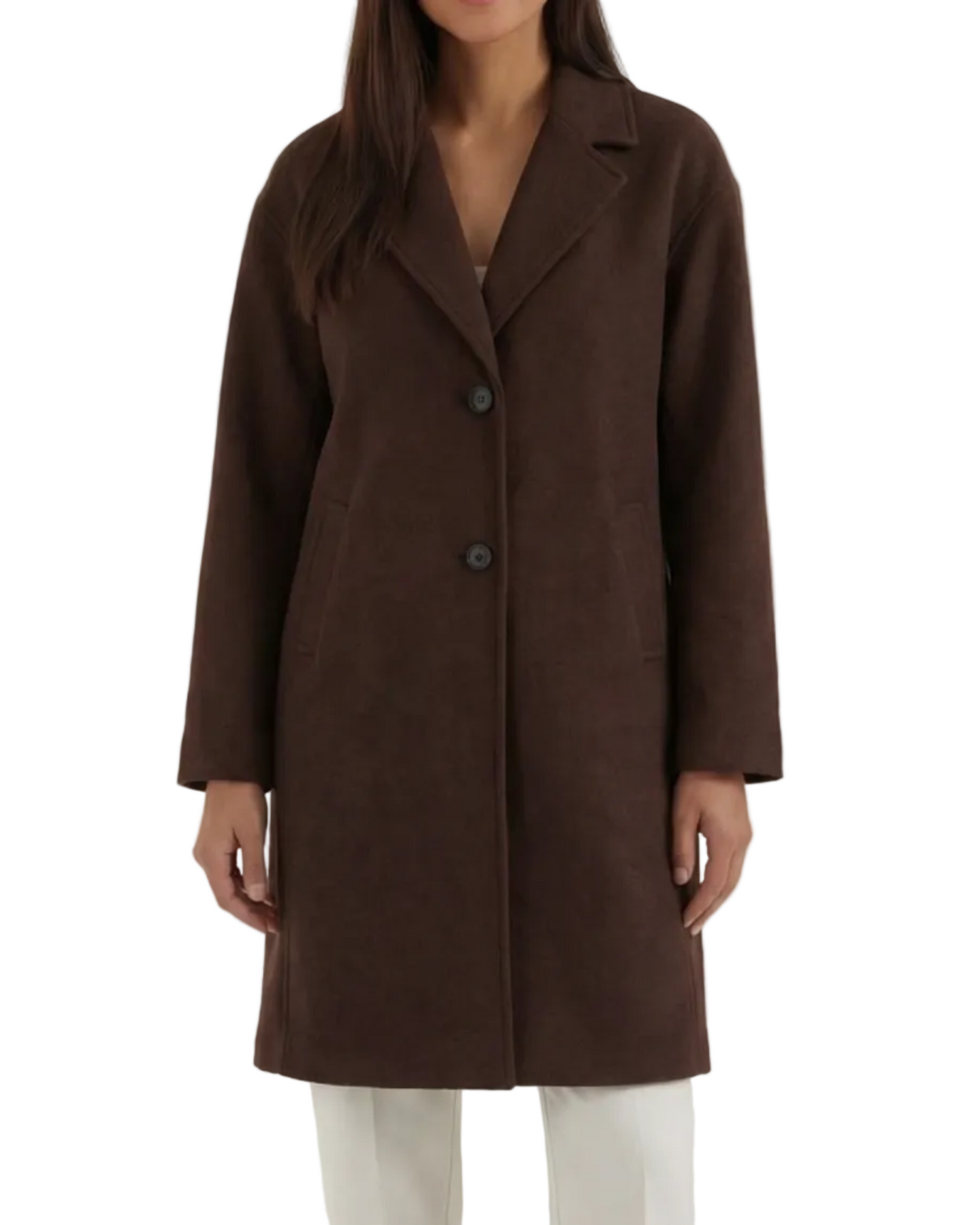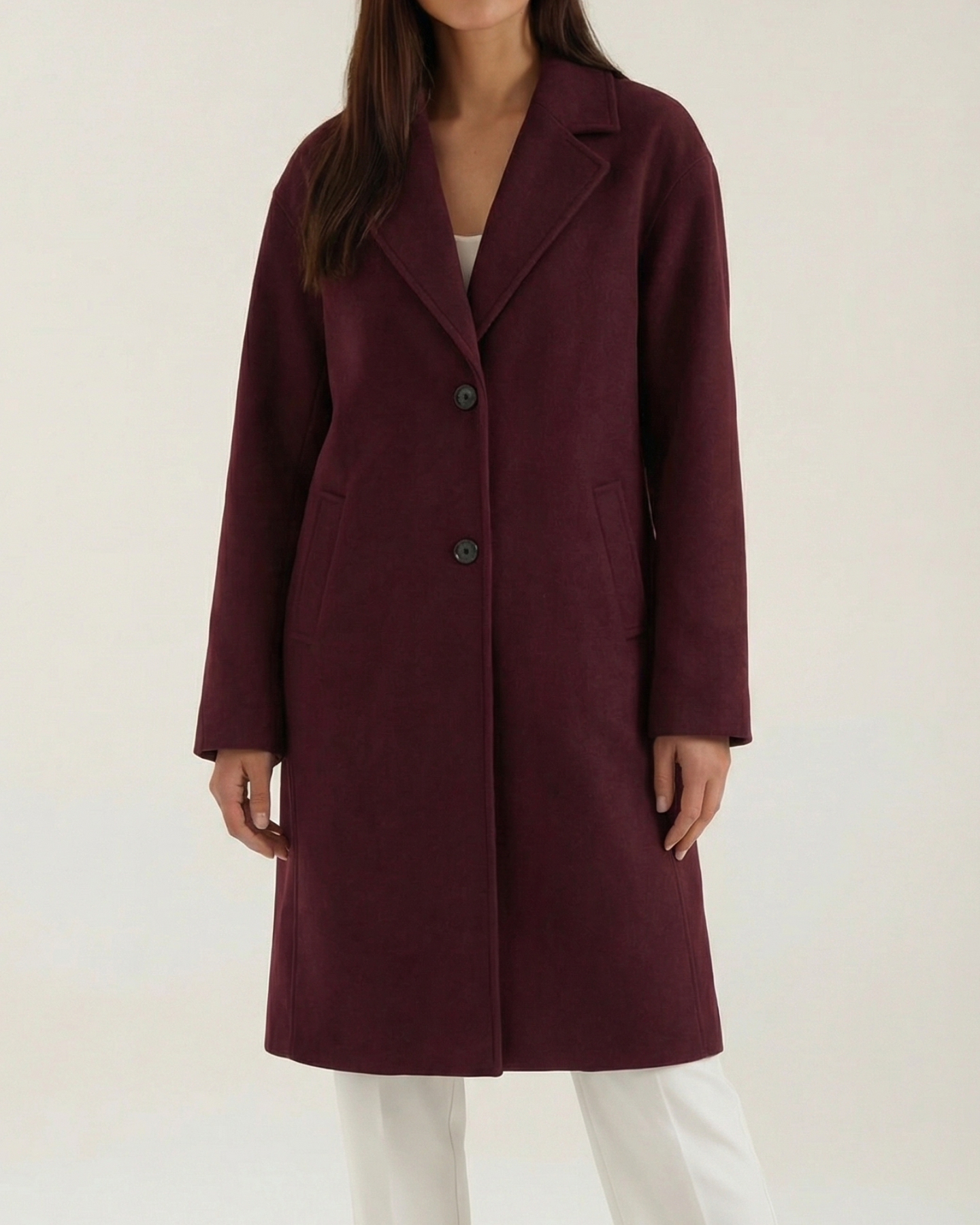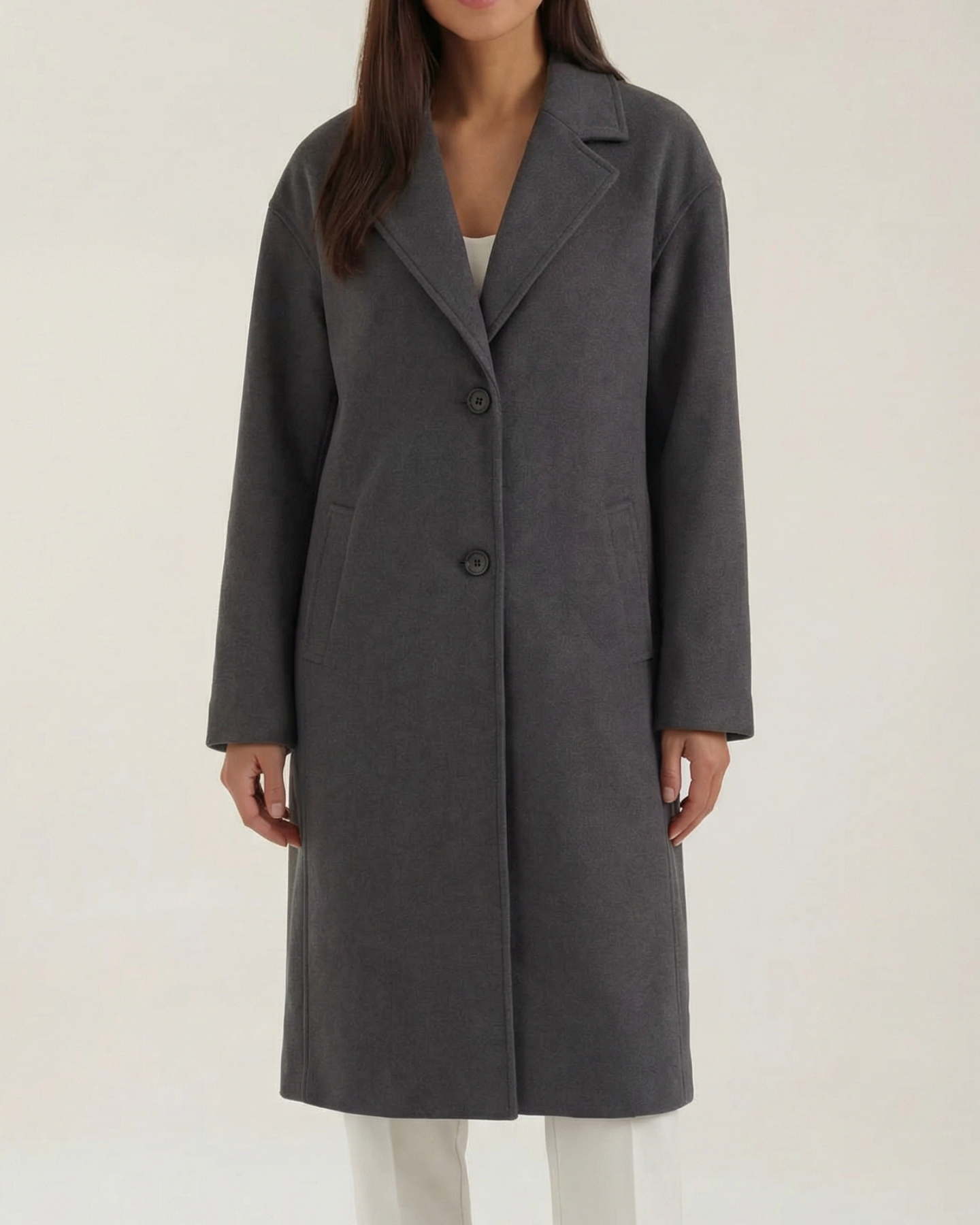 An oversized, long wool-blend coat with a smooth inner lining. Throw it on over anything — it pulls the whole look together instantly.