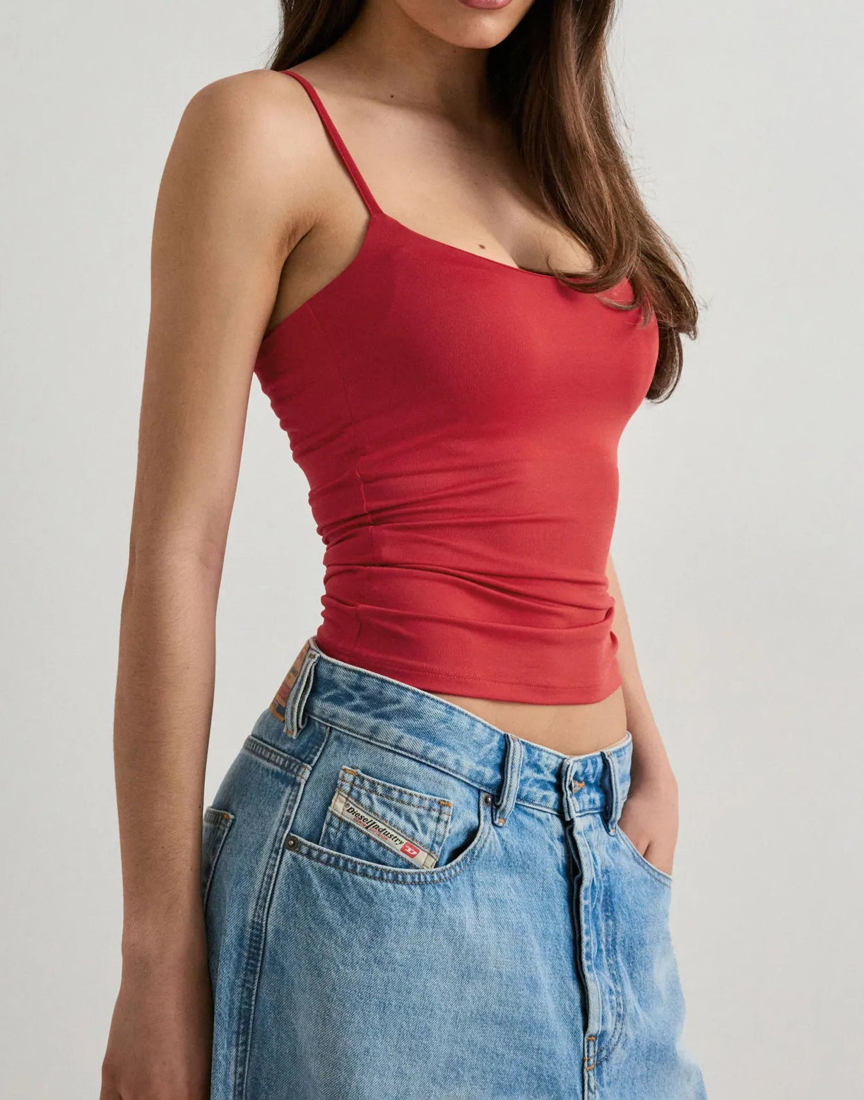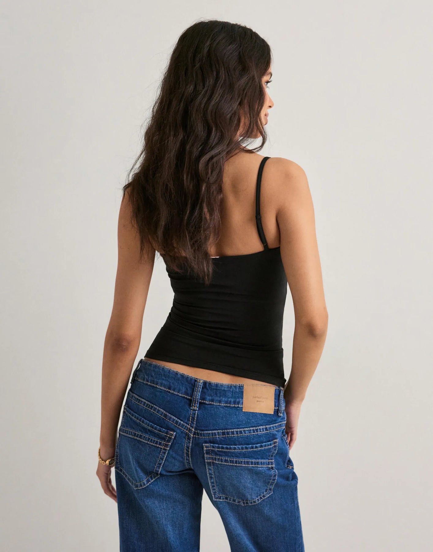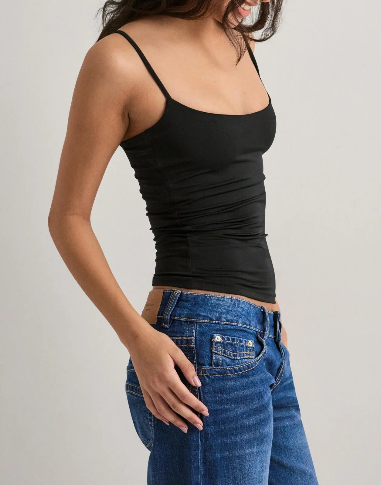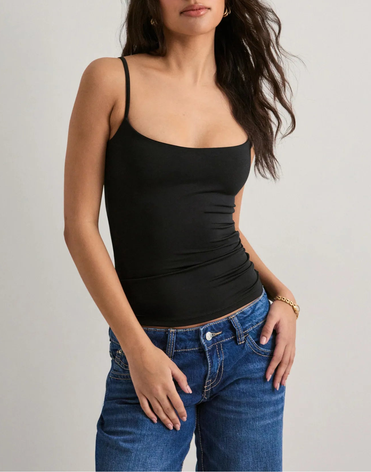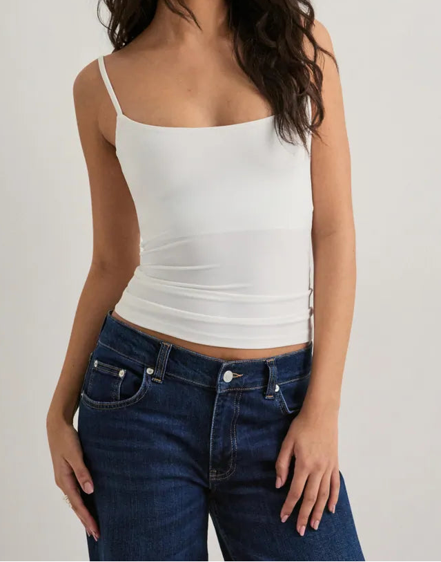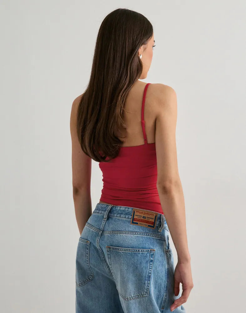 A fitted top with an elastic underband, padded bust, adjustable shoulder straps, and a subtle sheen. Built-in support, no bra needed.