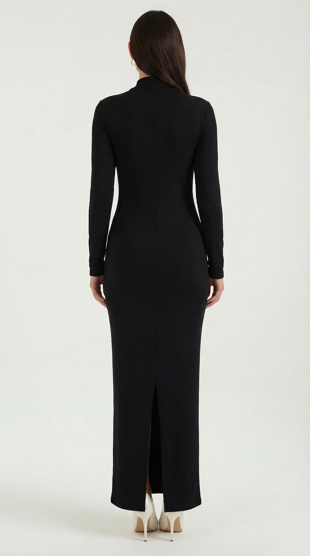 • Contoured Mass: The "curve-hugging" fit maps the body’s anatomical lines with total fidelity, terminating in a floor-length hem that anchors the garment’s dramatic vertical momentum.