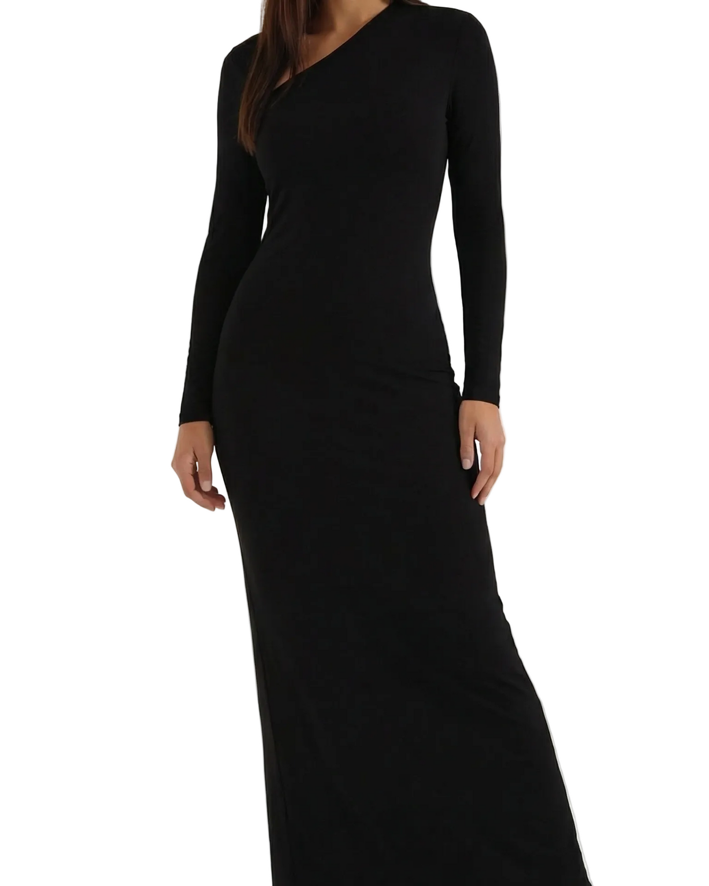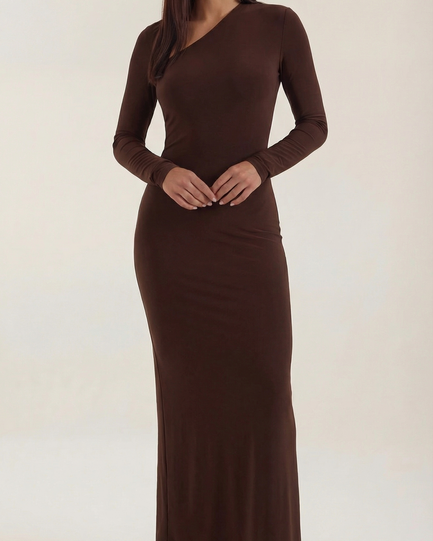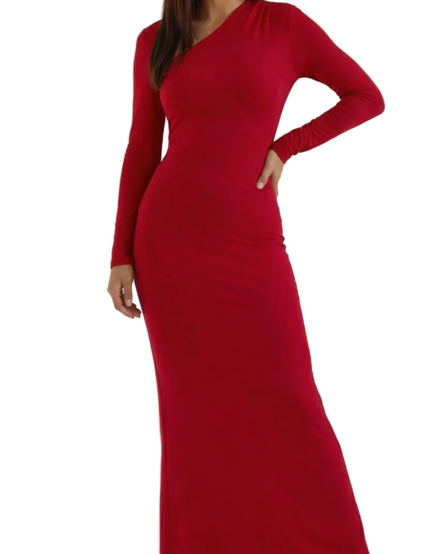 The Silhouette A study in diagonal tension. The Vector utilizes a high-impact, asymmetrical neckline to redirect the eye along a single, continuous line from the shoulder to the floor. By combining the "sculpted" compression of a bodycon fit with the elongated verticality of a floor-length hem, the garment functions as a living arrow—a sharp, directional silhouette that slices through the collection's more symmetrical, monolithic forms.