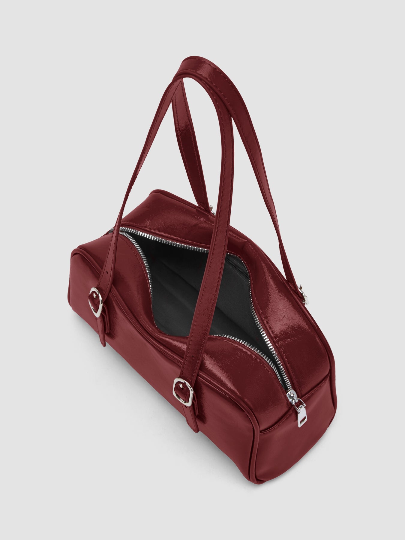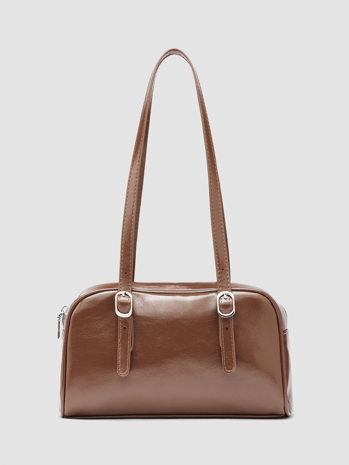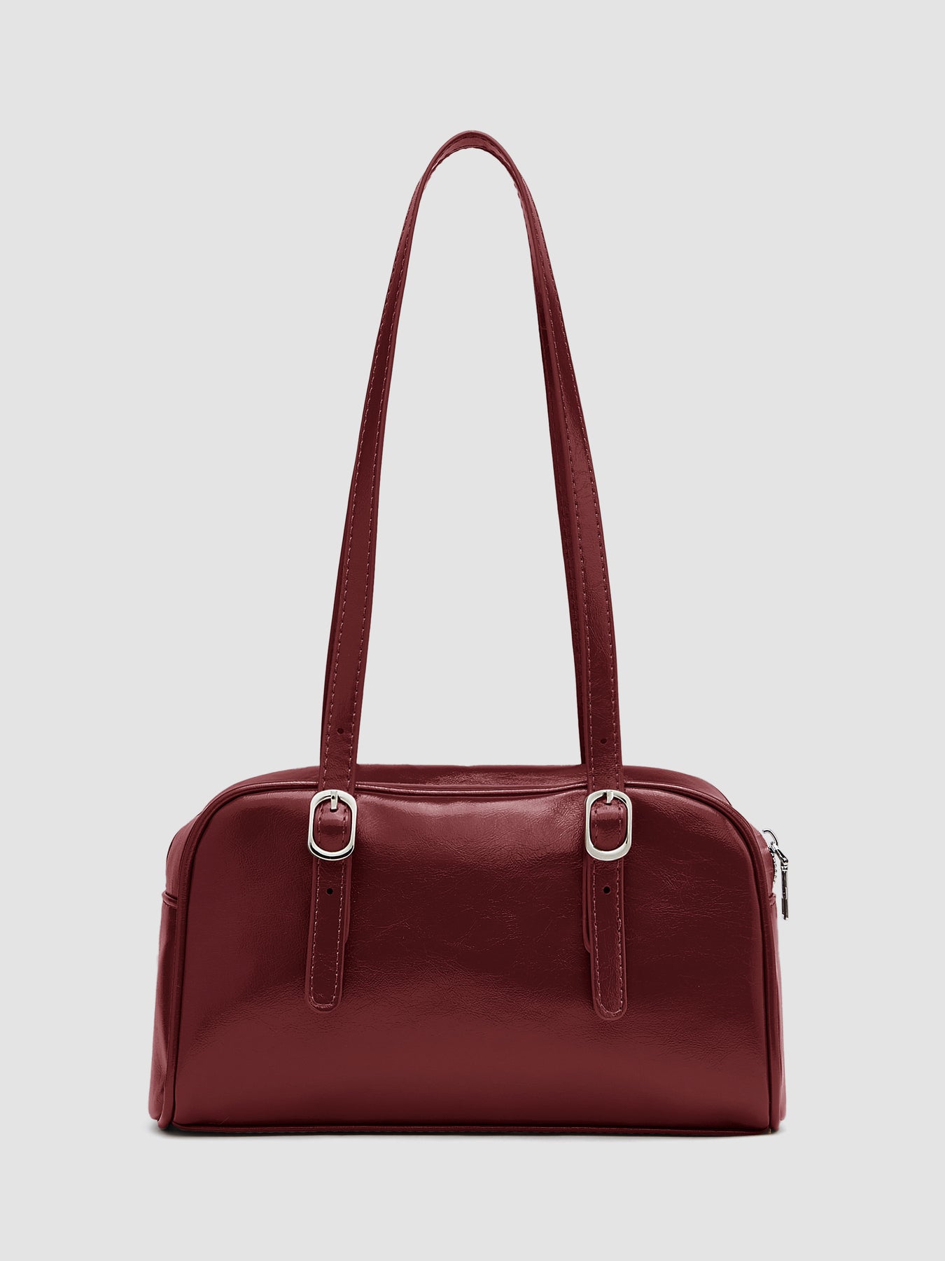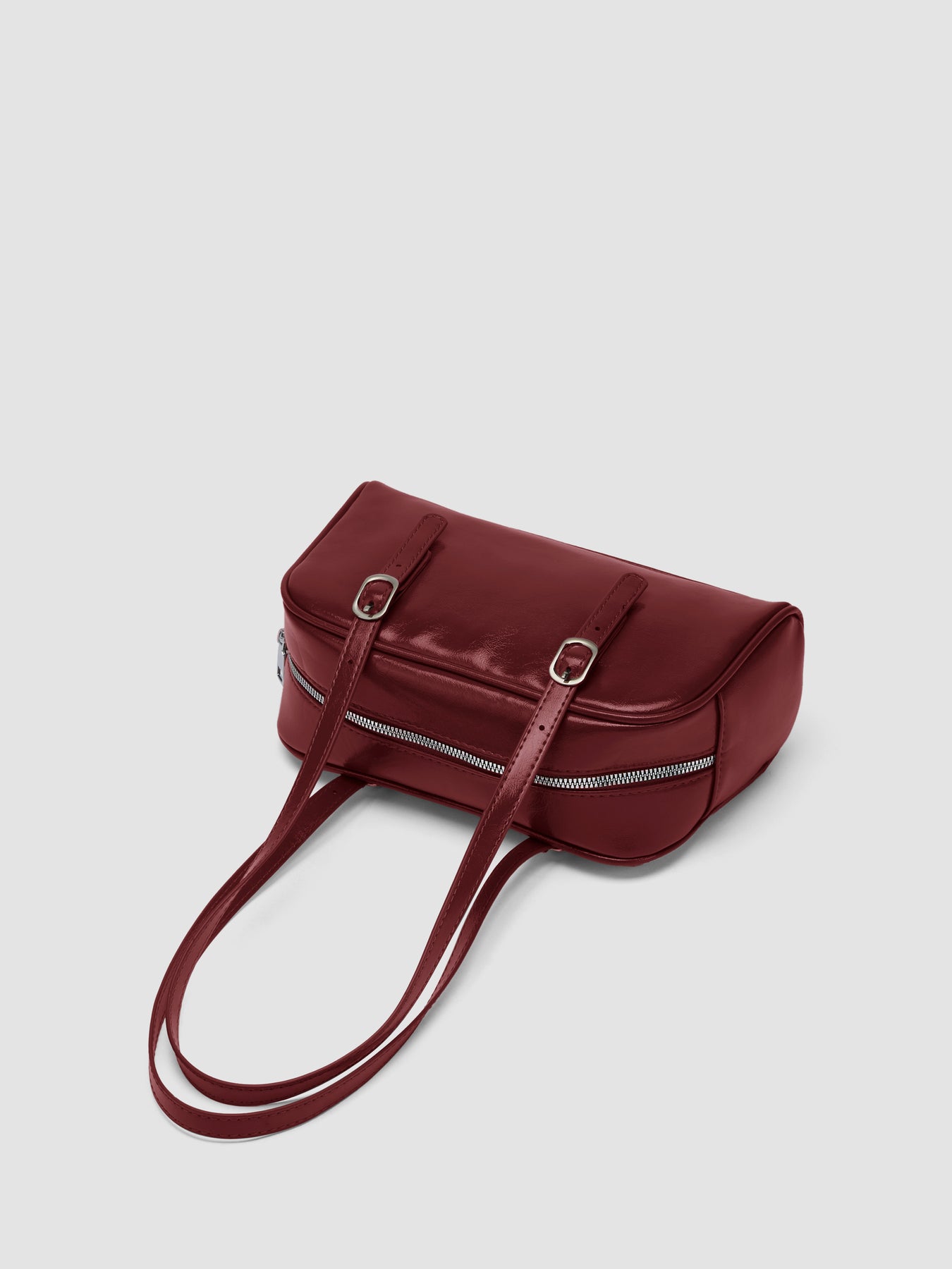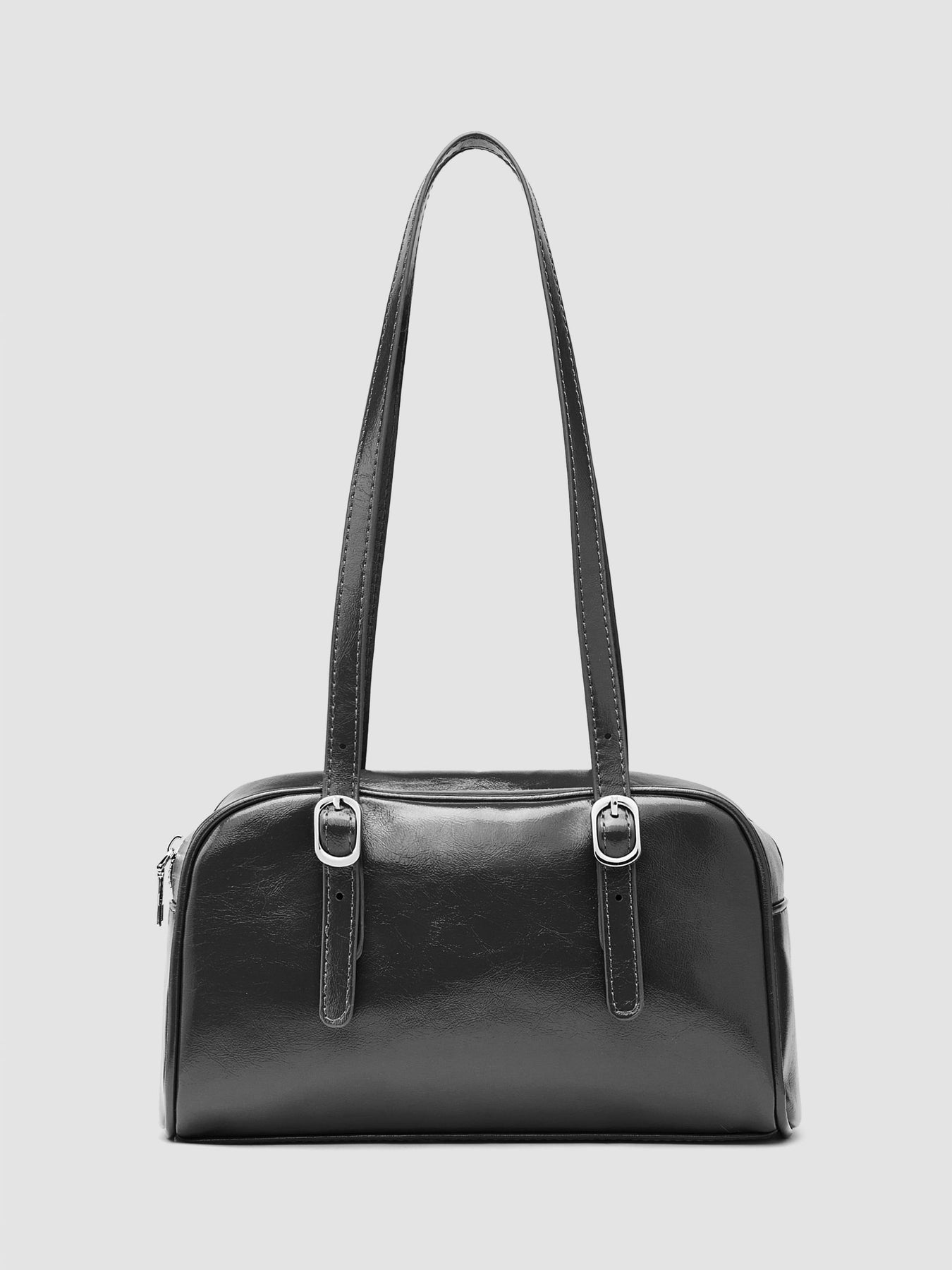A medium Boston-style bag with a structured rectangular shape, modular strap, and a recessed zip-top closure. Clean and minimal.