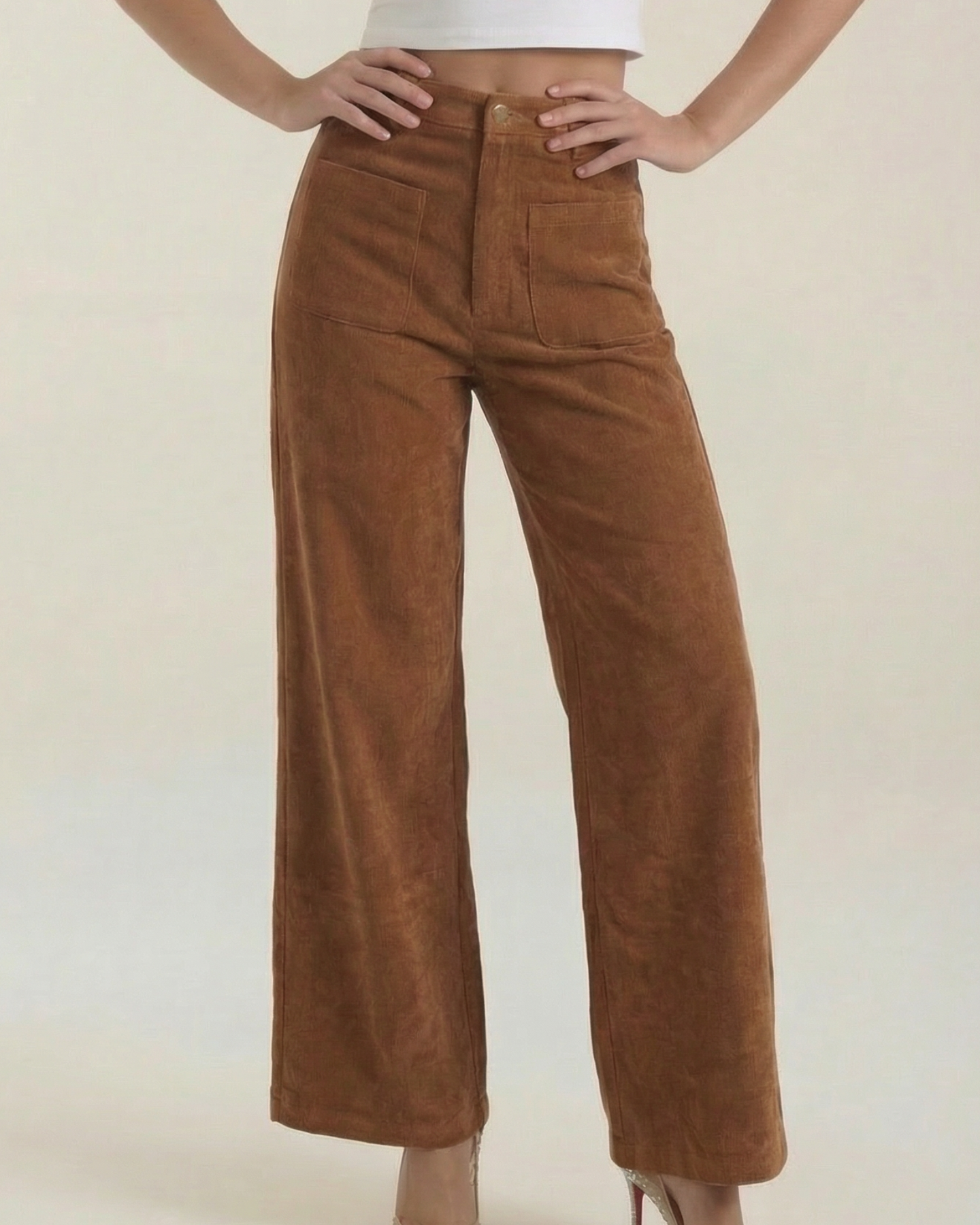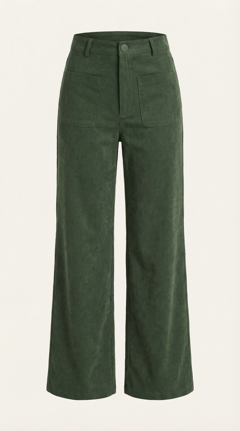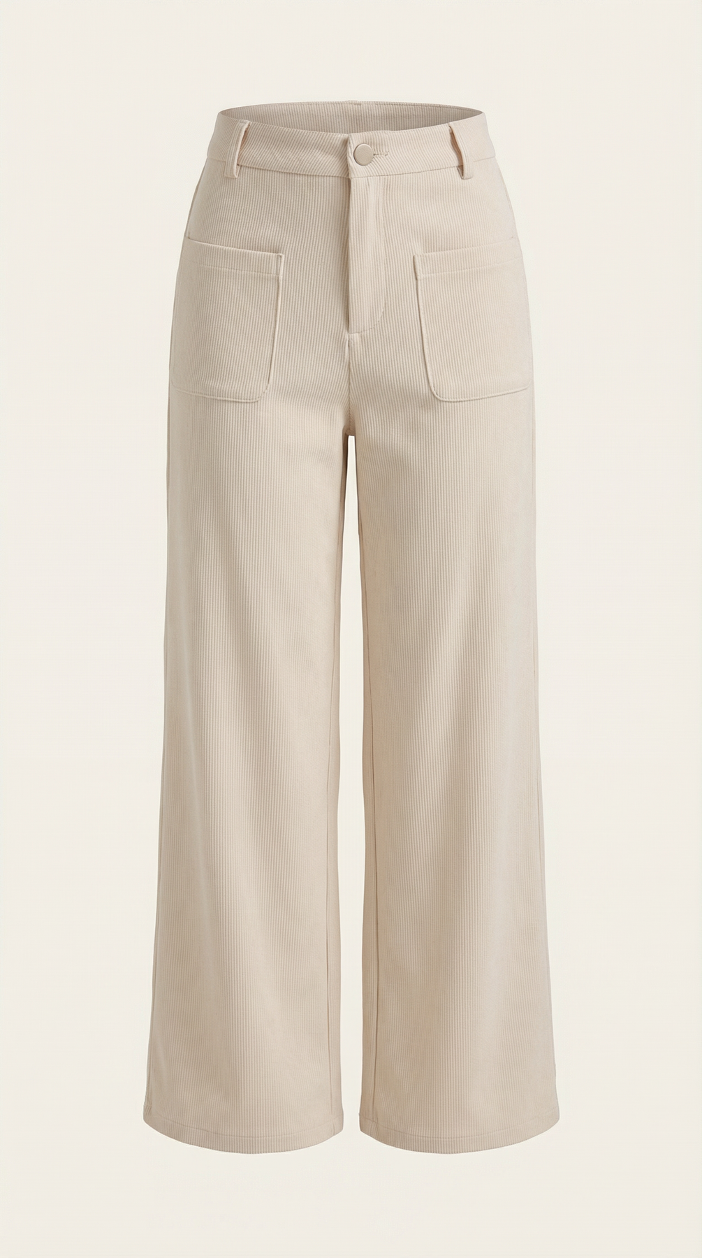 High-waist wide-leg trousers in a soft corduroy with front pockets. Flows beautifully when you walk — retro feel with a modern fit.
