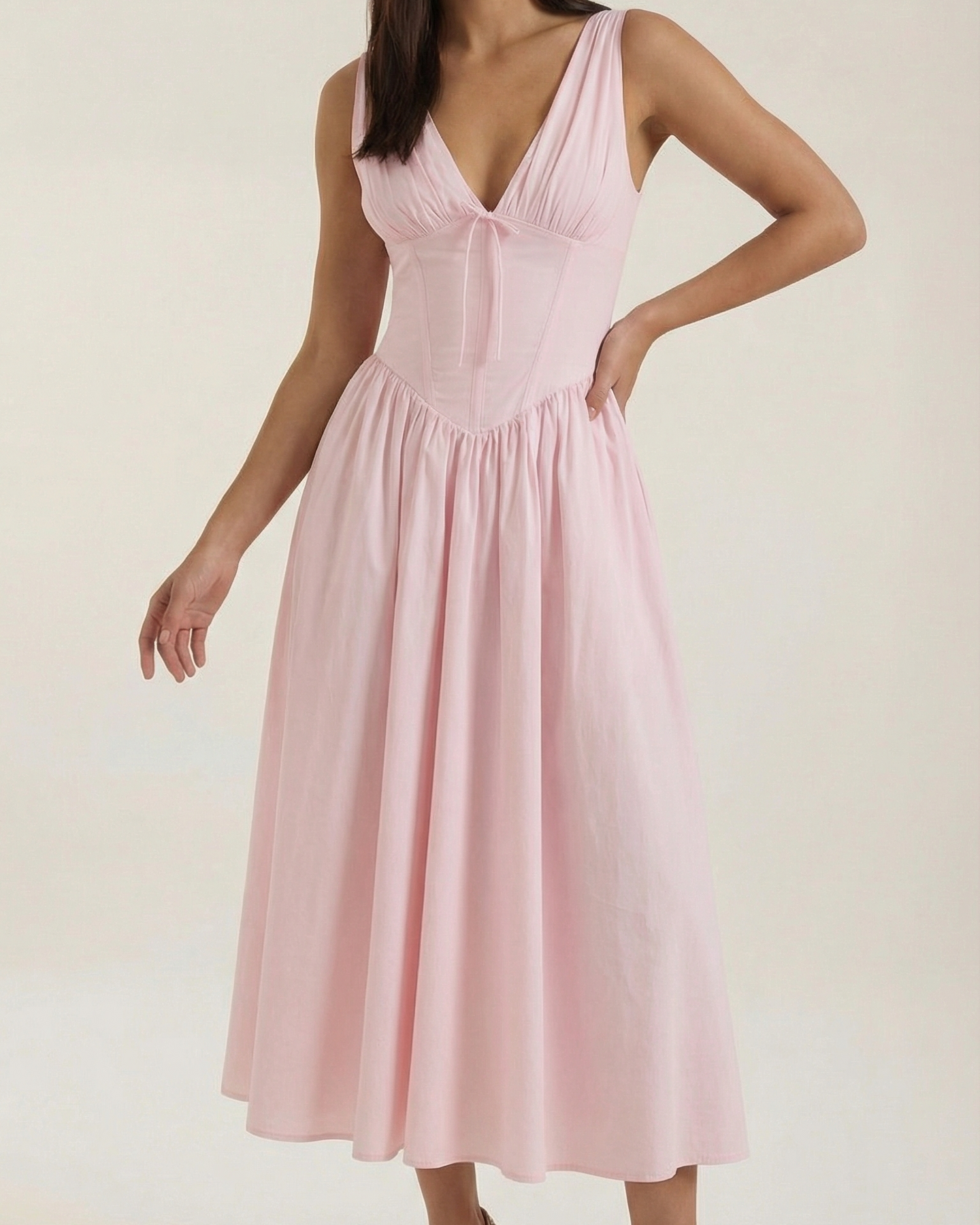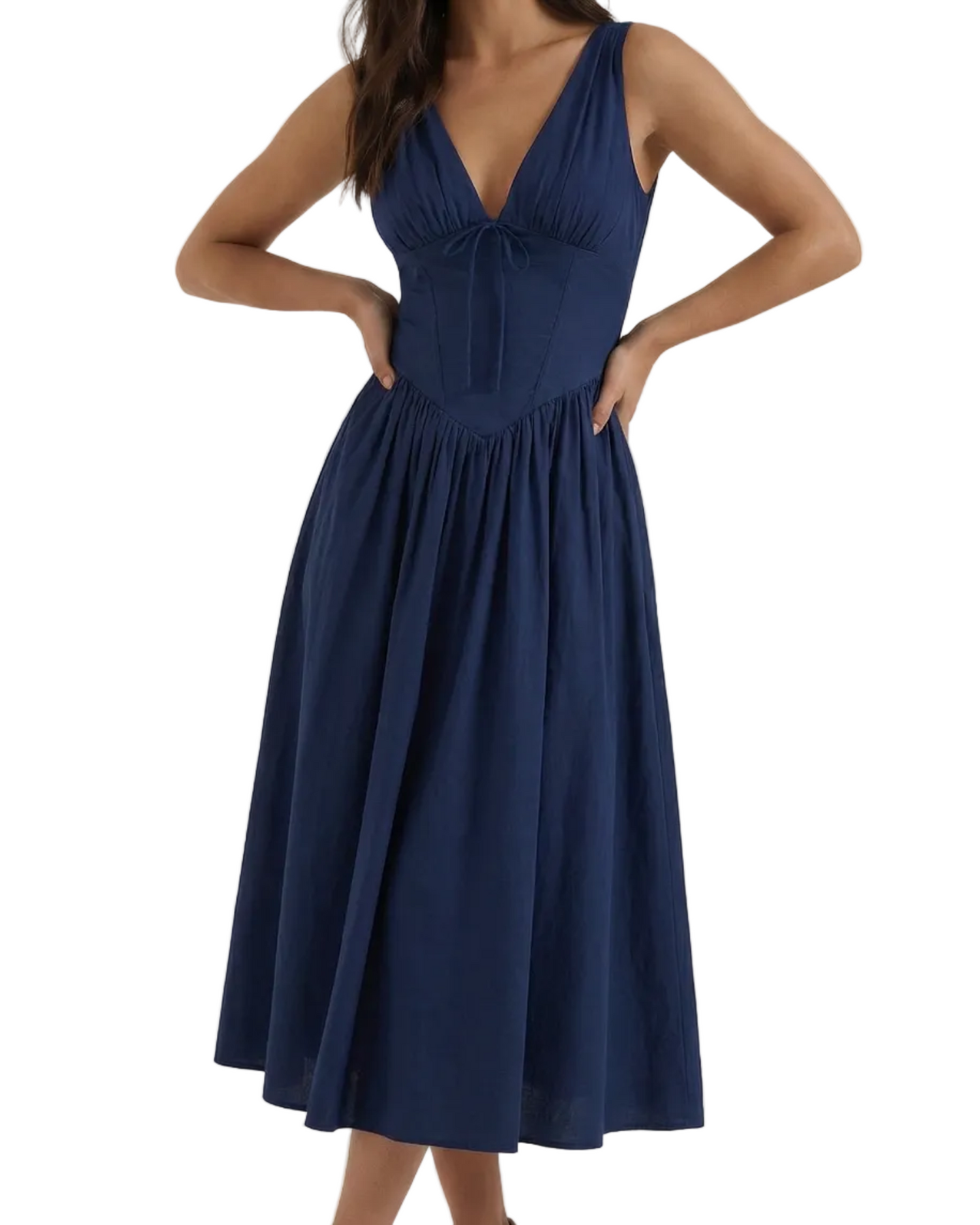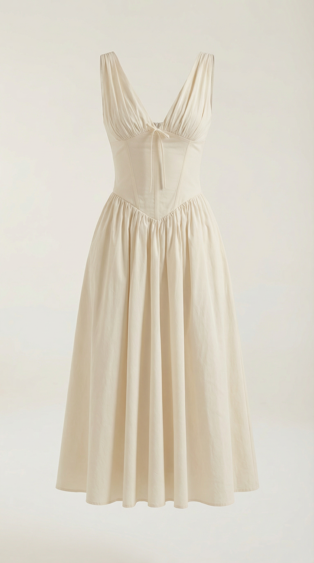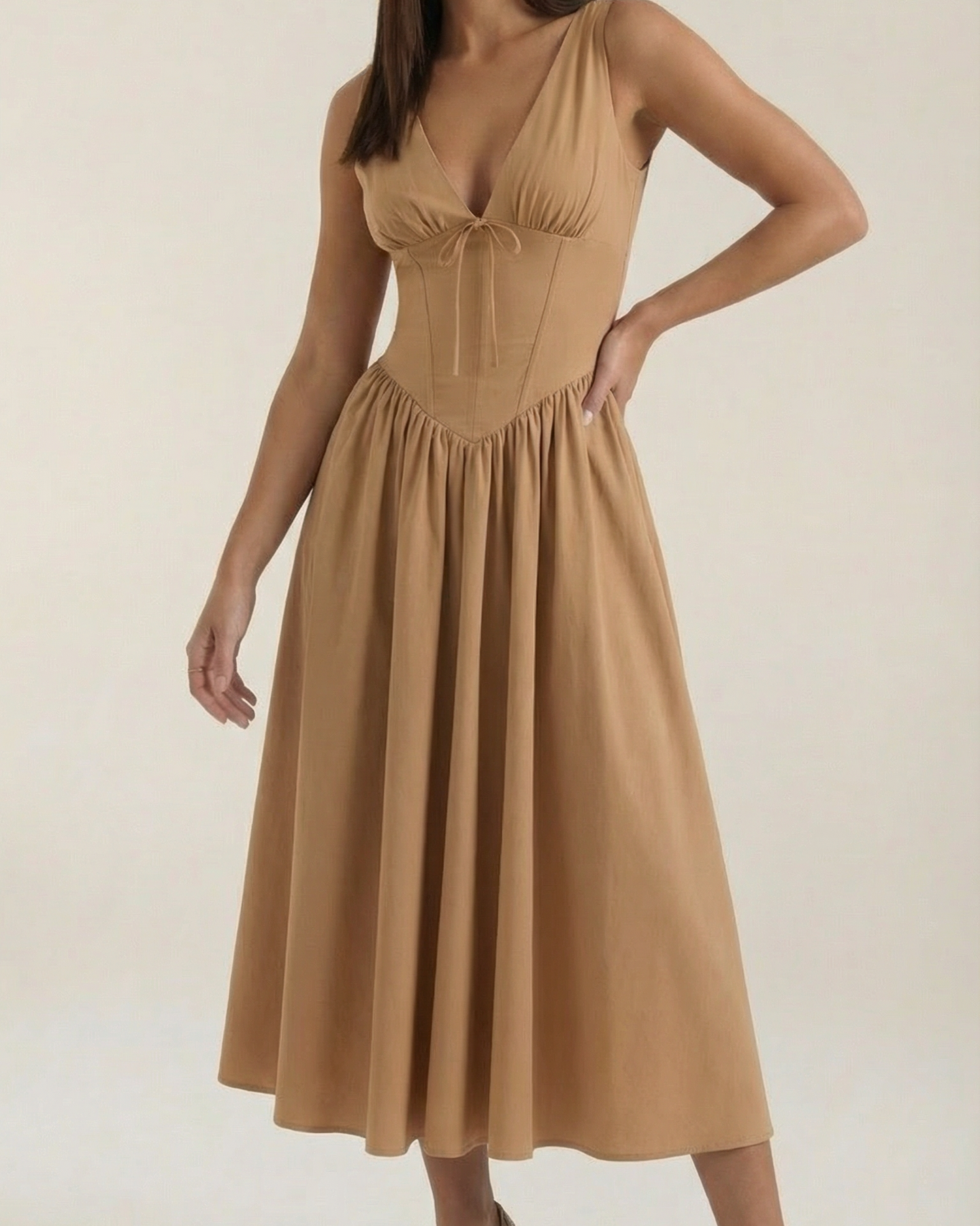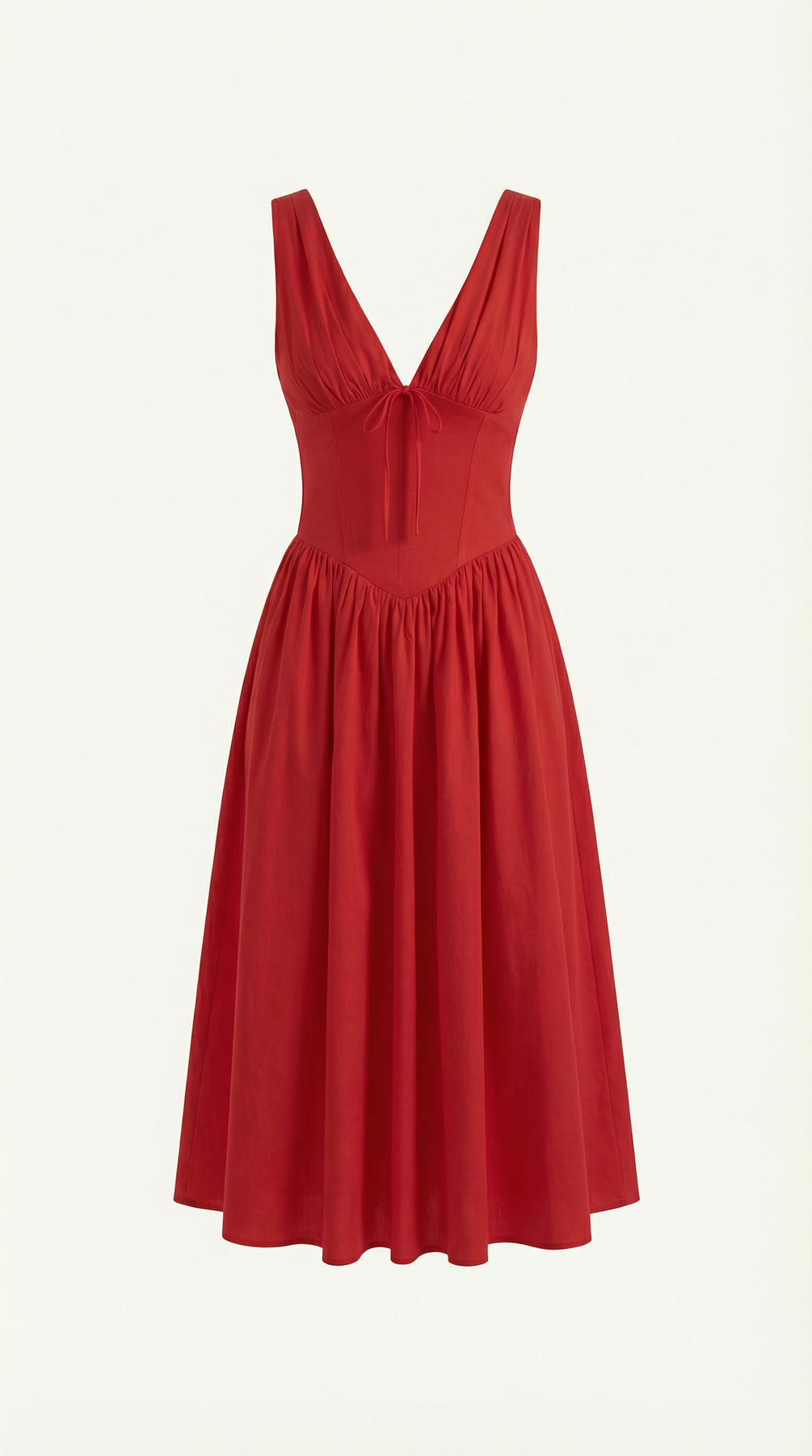 A midi dress with a plunging V-neckline, a twisted front detail at the chest, wide straps, and a full gathered skirt. Fitted on top, voluminous below.